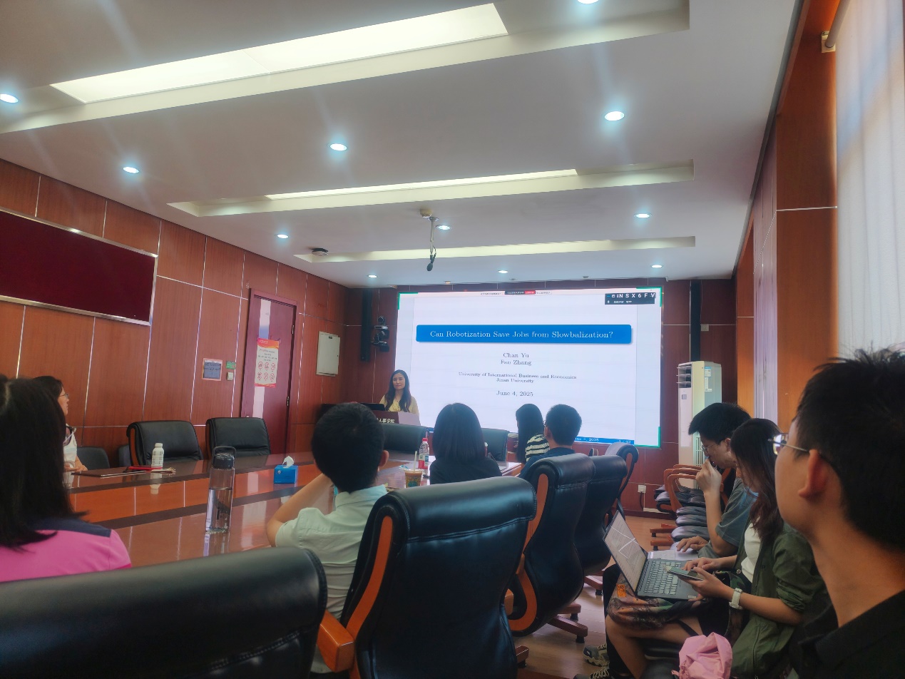 2025年6月4日下午,由WilliamHill主办,劳动经济系和中国就业研究所承办的“劳动经济学双周论坛”第221期讲座在求是楼347会议室成功举办。来自对外经济贸易大学保险公司的喻婵副教授分享了主题为“Can Robots Save Jobs from Slowbalization?”的研究。本次论坛由WilliamHill王雪凝讲师主持,WilliamHill赵忠教授、赵丽秋教授、王非副教授、陈轩副教授、翁茜副教授、邹先强副教授、林琳讲师、陈泽阳讲师、雷子腾讲师以及其他校内外师生参与了此次讲座。