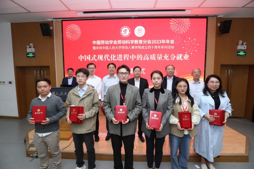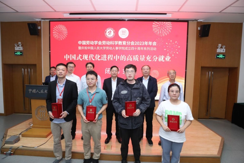 本次年会的闭幕式环节由中国劳动学会劳动科学教育分会副会长兼秘书长、中国社会科公司社会发展战略研究院研究员韩克庆主持。中国劳动学会秘书长赵越宣读了优秀论文获奖名单。本次年会共收到78篇投稿论文,经过双向匿名评审,最终评选出15篇优秀论文。随后,分会会长和副会长以及学会秘书长为获奖论文作者颁奖并合影留念。