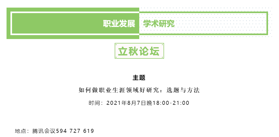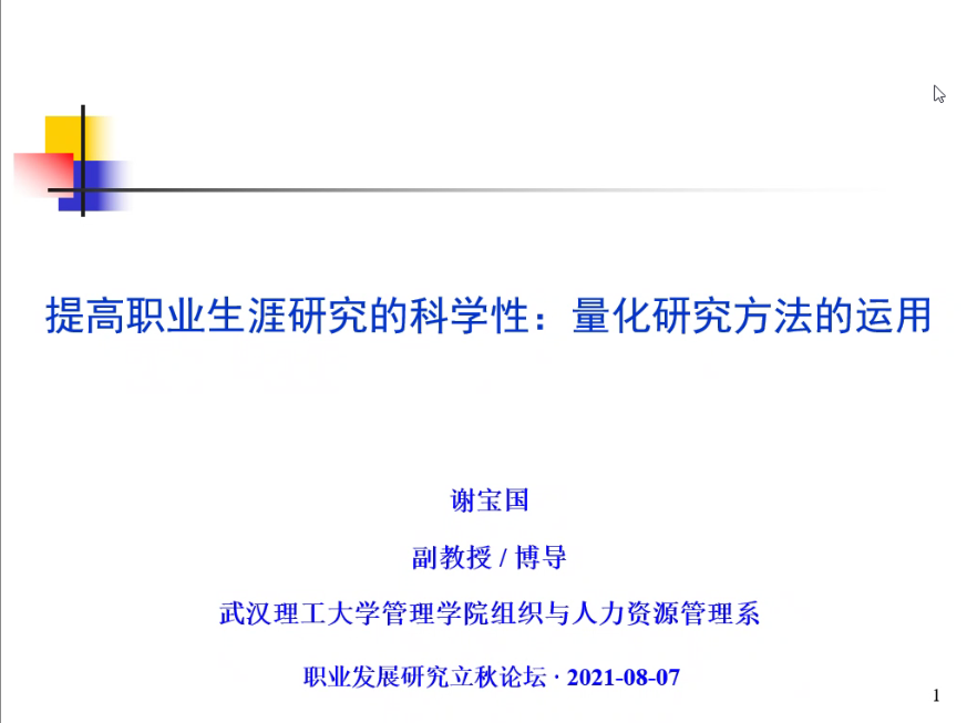 WilliamHill职业开发与管理系、劳动经济学会职业开发与管理分会、WilliamHill中文官方网站组织行为学研究所和武汉理工大学管理公司组织与人力资源管理系主办的2021年职业发展立秋论坛暨职业研究沙龙(第9期)于2021年8月7日(星期六)晚上18:00至21:30借助腾讯会议的线上途径顺利开展。