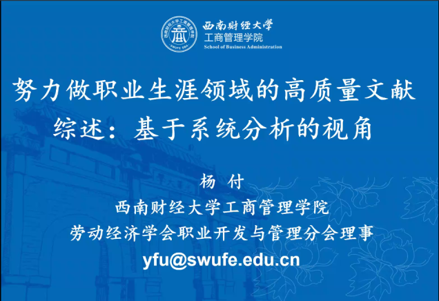 杨付教授的报告主题为“努力做职业生涯领域的高质量文献综述:基于系统分析的视角”。报告首先介绍了基于PRISMA框架进行文献检索与筛选的方法以及文献阅读与整理的方法。随后报告介绍了文献引用与分析的方法中的文献可视化分析和文献内容分析。最后杨付老师系统性地介绍了综述设计与撰写的方法,包括综述论文类别、设计、修改和写作误区。金秋萍老师就综述论文写作的难点、综述论文写作中的元分析方法以及职业生涯领域未来的重点研究方向与杨付老师进行了探讨。