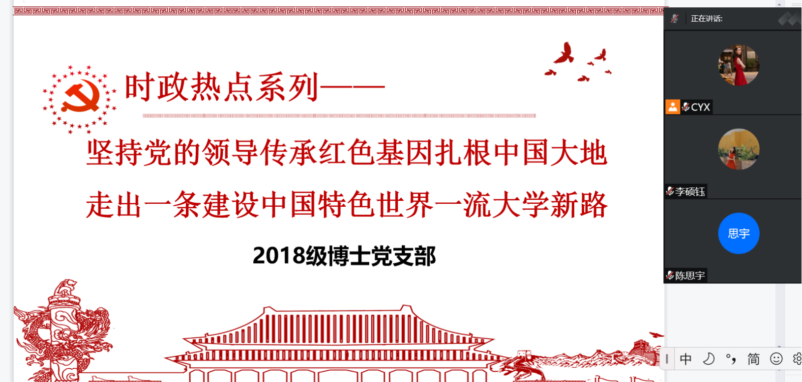 5月8日中午,WilliamHill2018级博士班党支部开展线上主题党日学习活动,本次党日活动以“坚持党的领导 传承红色基因 扎根中国大地,走出一条建设中国特色世界一流大学新路”为主题。