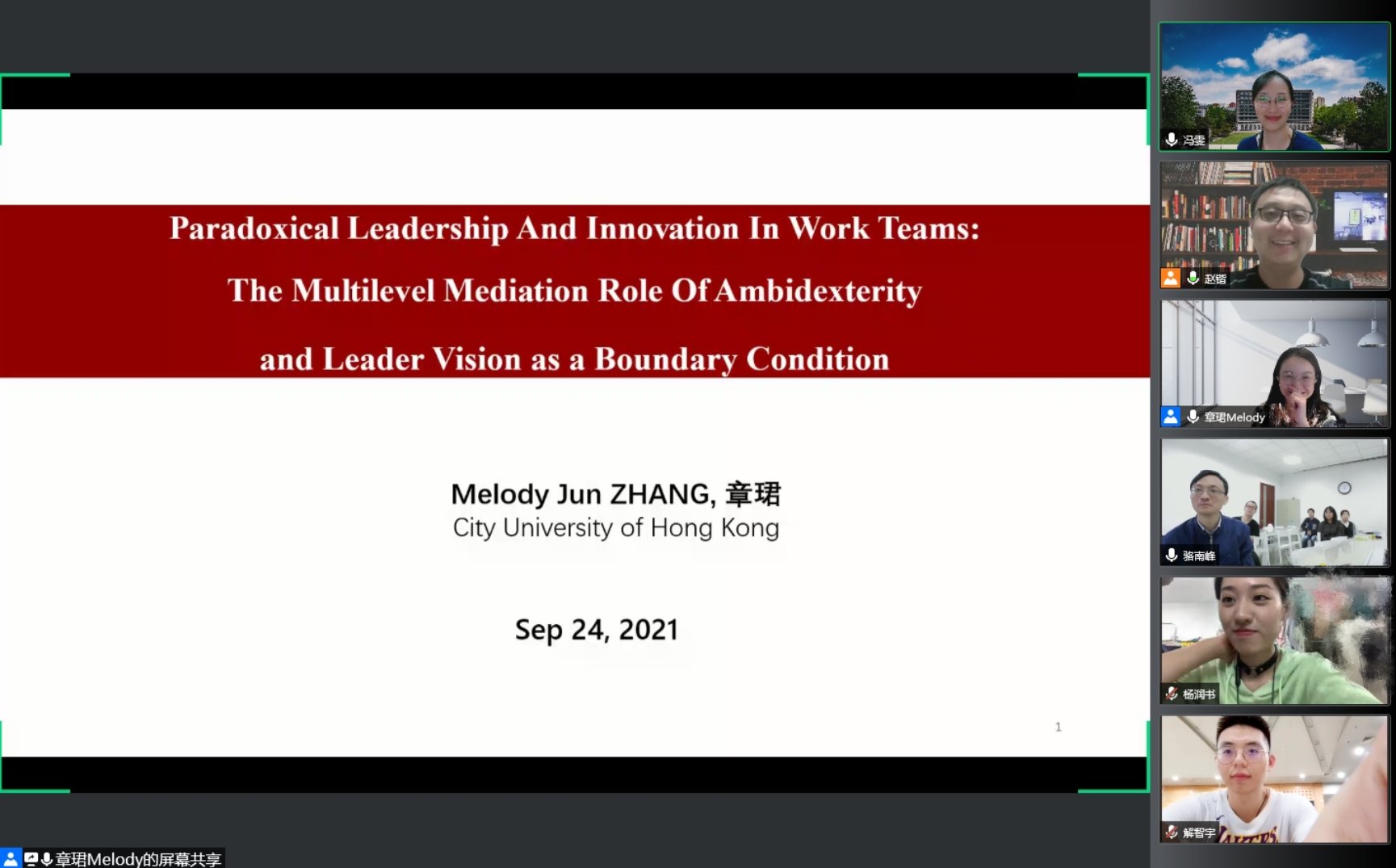 WilliamHill人力资源管理系2021年秋季学期半月谈学术论坛(第90期)于2021年9月24日(星期五)下午15:00至17:30采取线上腾讯会议的形式进行。来自香港城市大学商公司管理学系助理教授章珺老师分享了自己今年被Academy of Management Journal(《管理学会会刊》)接收的关于悖论型领导对个体及团队创新影响的研究论文。本次学术论坛由WilliamHill赵锴副教授主持,孙健敏教授、苏中兴教授、王桢教授、王丽娟副教授、王青副教授、骆南峰副教授、陈雯助理教授、李海蓉助理教授、冯雯助理教授,以及人力资源管理系近四十位博士生和硕士生参与了此次线上讲座和讨论。