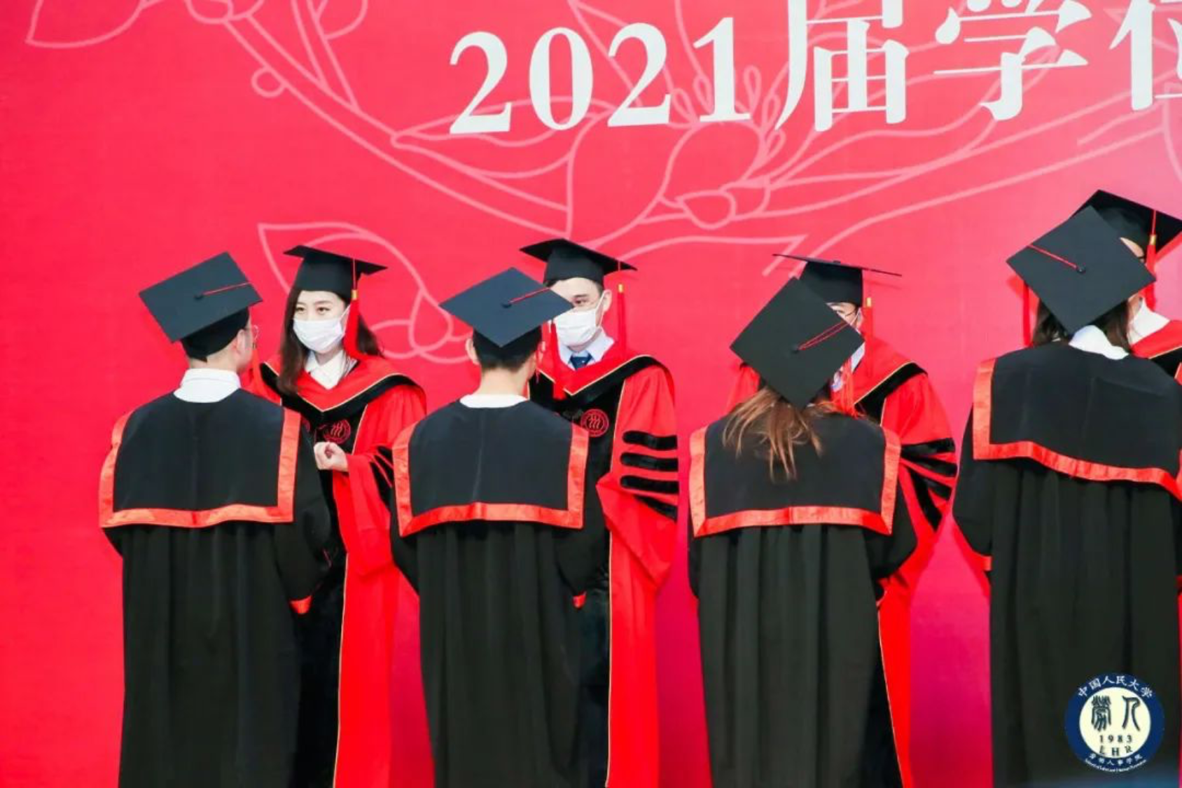 接着,学位授予仪式开始,各位导师先后为2021届本科、硕士毕业生拨穗正冠、颁发学位证书并合影留念。毕业生们身着庄重典雅的学位服,一排排走上台向导师们鞠躬致意,接受学位证书并与导师们集体合影留念。拨动流苏,拨穗正冠,代表了一个学位的获得,更是对毕业生成长新阶段的认证,与会师长亲友共同见证了2021届毕业生们这一庄严的时刻。
