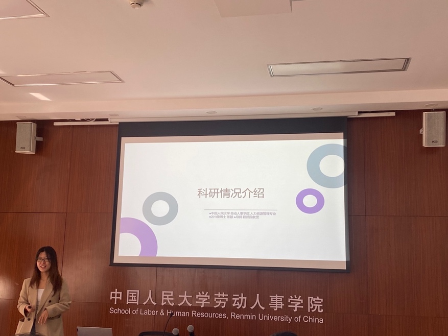 张颖同学从科研情况概述、论文发表情况、研究论文展示和未来研究计划四个方面进行了分享。张颖同学的研究兴趣主要聚焦于领导幽默和员工主动性,目前已在《心理学报》、《Journal of Business Research》等多个期刊上发表文章。她重点介绍了其中一个研究——同事主动行为如何激发员工动机和绩效,详细阐述了研究动机、理论模型、主要结论和研究贡献等方面。张颖同学表示,在未来将进一步深化领导幽默研究,探讨领导幽默风格的形成和作用机制,也会关注成功老龄化、人工智能对员工的机遇和威胁等主题。